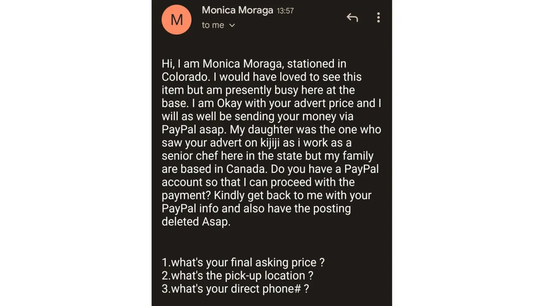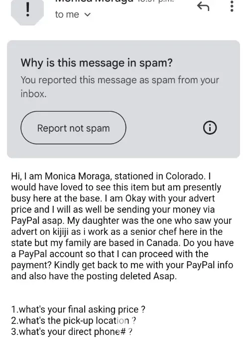 i just got same message for a stroller i have on kijiji. it was sent as a text to give direct email "cos" i get charged when i text or email my mom. moniccamoraga@gmail.com so i dont have paypal acct i replied to see if they could e transfer becasue little info for auto deposit is ok for me paypal charges fees. so waiting i decided to check the email address and it brought me here. i am sad because i got hopes up there being in money dispair between myself and toddler daughter so i really cud have used this sale so so much. i just wanted something to go my way and then this scam... how does this one pick its victims out do i put a "hey you over here i want to be scammed out of money i dont have lol pick me pick me pick me or is it randomly sent to unknowns to see who bites on it?