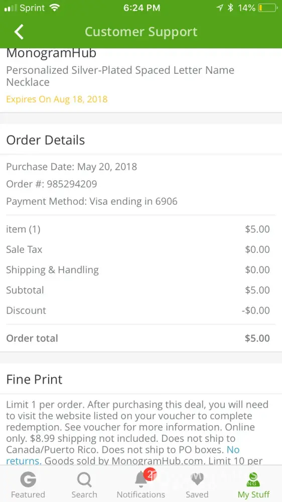 i purchased a monogram necklace for Monogram Hub. The purchase was made on a Groupon account email i no longer use. [protected]@yahoo.com. The groupon asked for a code to complete my purchase for the personalization of the necklace but when i couldn't find it so i hit the redeem button and now i have lost the necklace. order # [protected].
