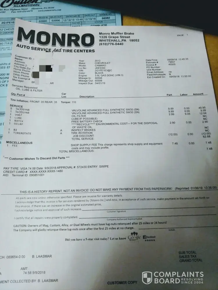 My name is Gary Krupa, and my Family of (4) have consistently brought our cars/SUV's to Monroe Medford NJ for over 10 years. During this time, Steve the Manager was amazing and always provided quality care and service to his customers. We were loyal to Steve and brought in many of our friends. Steve recently retired, and I have had a horrible experience...