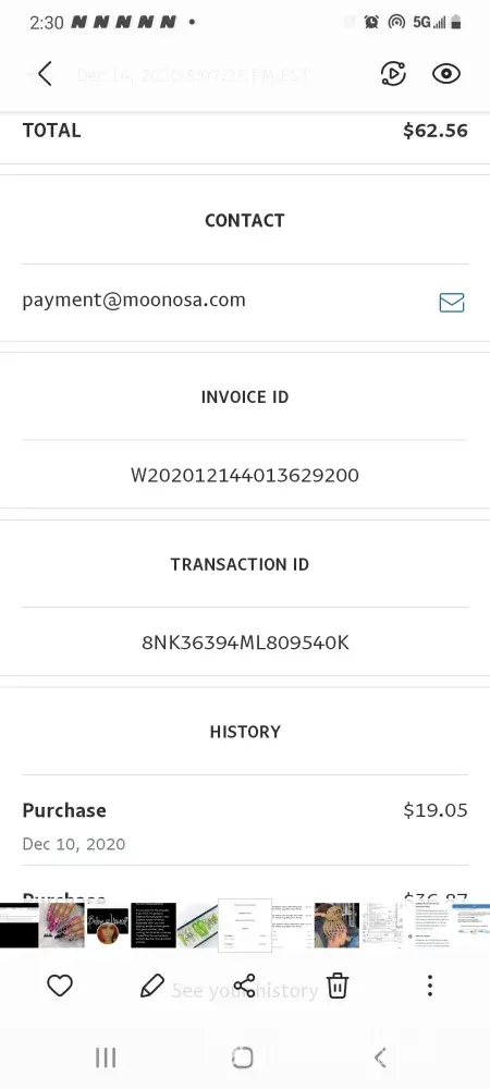 I made an order through moonosa but never got my package because they put an unrecognizable address which of the one wrong of course in the usps post office man said that it not recognized as a delivering address I need my money back or. they need to resend I. D number W202012144013629200. Transaction I. D 8NK36394ML809540K the total amount was $62.56