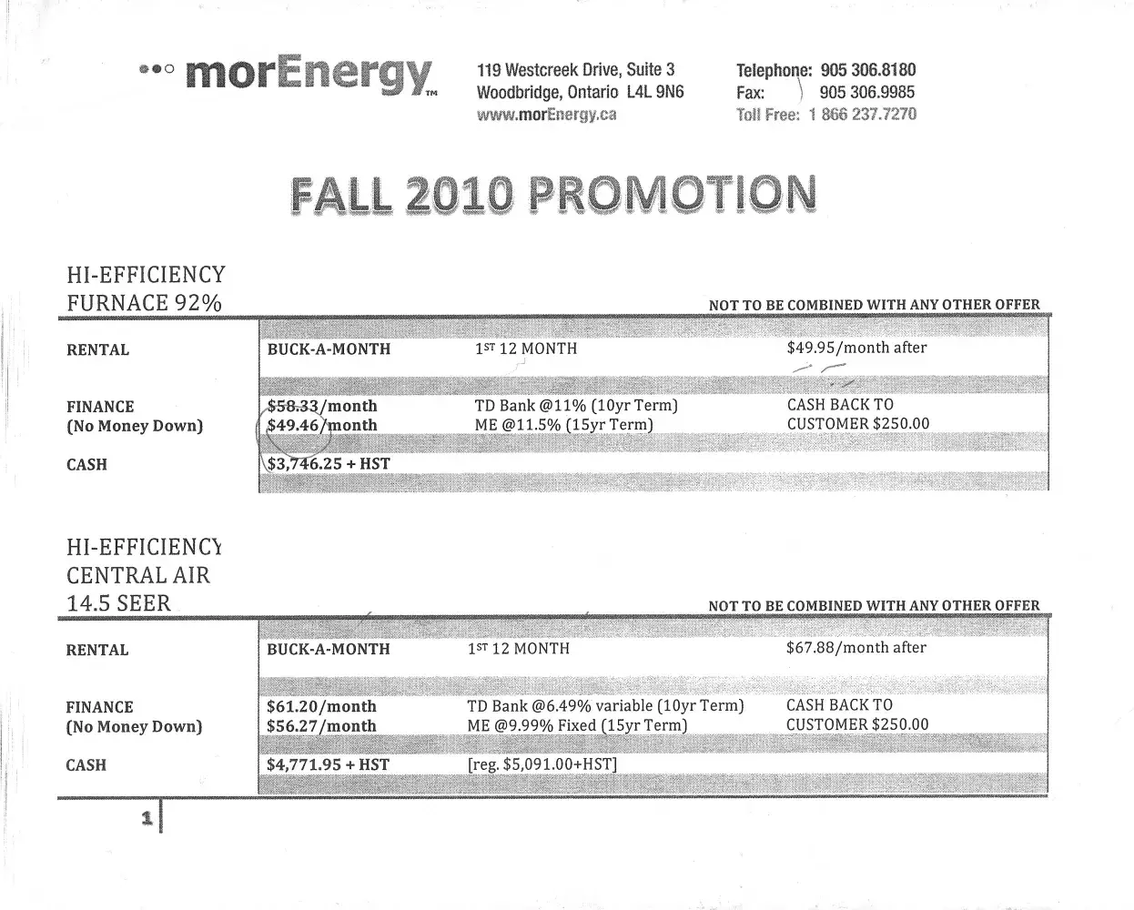 At the end I didn't purchase the unit from morEnergy, I'll just save to purchase a High Efficiency Furnace from different sources for a more economical price. Also here's an attached scanned promotional offer that they gave me. It looks nice until you do all the calculation.