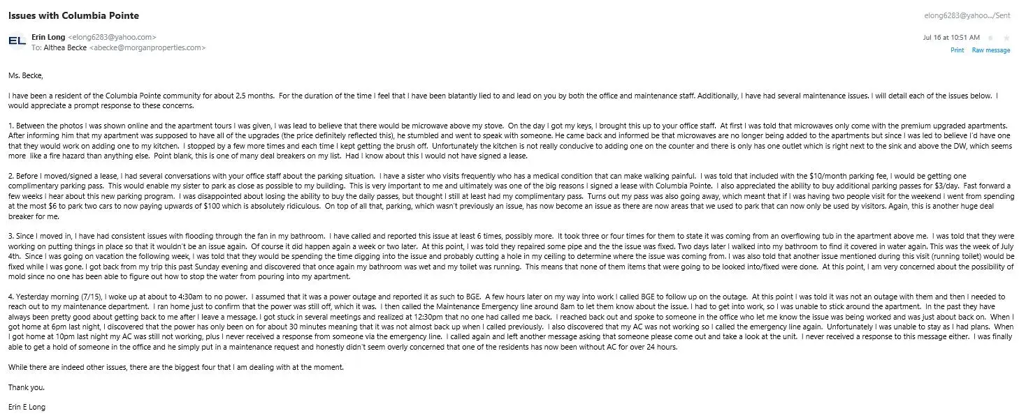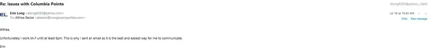 I reached out to the Property Management office in the middle of July to discuss several of the issues I have been having with the apartment and the property, see list below. The only response I received was the schedule an in-person discussion. I immediately responded to explained that this was difficult as I am normally at work during the hours the office...