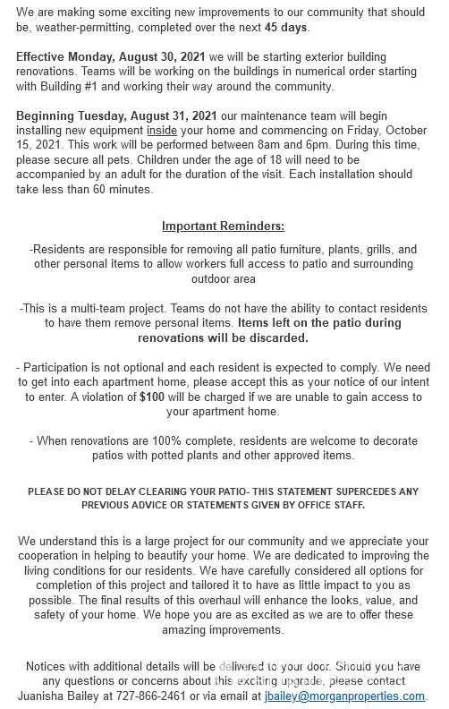 You cannot give residents 3 day notice to remove the patio furniture and plants and threaten to throw away people's personal items that have been here for years. There is no space in my apartment for these items and if they are thrown out I will file a police report. If your workers will throw away people's items they can at least just work around/move them or give the resident a space to temporarily move their items for the day.