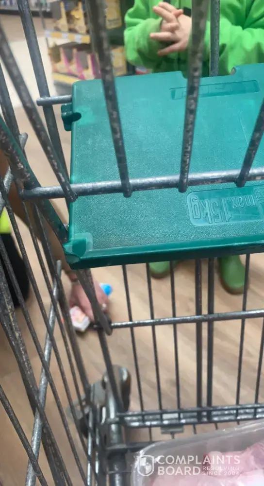 I took my children shopping and placed my daughter (11month old) in the trolley. While shopping I realised her leg was trapped in the back of the seat of the trolley. I notified a member of staff to ask for help and I can not complain about how well the start all were to come and help. After pushing and pulling and trying to free her leg with no result I rang the fire brigade as my daughter was very distressed as were my 2 other children who were with me. Luckily a lady shopper came over to help and noticed that a part of the seat was snapped and this is how her ankle had managed to get through the small gap, the lady and a male member of staff then tried pushing and wiggling the broken seat to free her leg which they eventually did. The male member of staff was very helpful and friendly with my daughter trying to reassure her. He leg was swollen and bruised and she wouldn't allow us to touch it afterwards. Other members of staff were also very helpful afterwards and gave my son sweets while we seen to my daughter I can not fault the staff although, there seemed to be no first aider on the premises as I was only given a wet flannel and told to put it around my daughters leg and to get it checked at home. Even though the staff were very helpful afterwards I feel like this incident could have been avoided if the trolleys had been checked. It would have saved me and my family a very traumatic shopping experience.