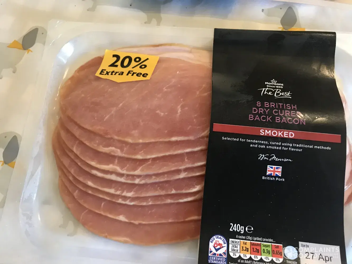 Hi I purchase the same bacon every week from your stores I buy the best packed bacon 8 slices 240gms 2 packs for £4.00 today I bought the same bacon but the packs I bought today had a 20% extra free sticker on but I cannot get my head round this they is 8 slices weighing 240gms can you tell me where the extra 20% is please i am sure this is illegal