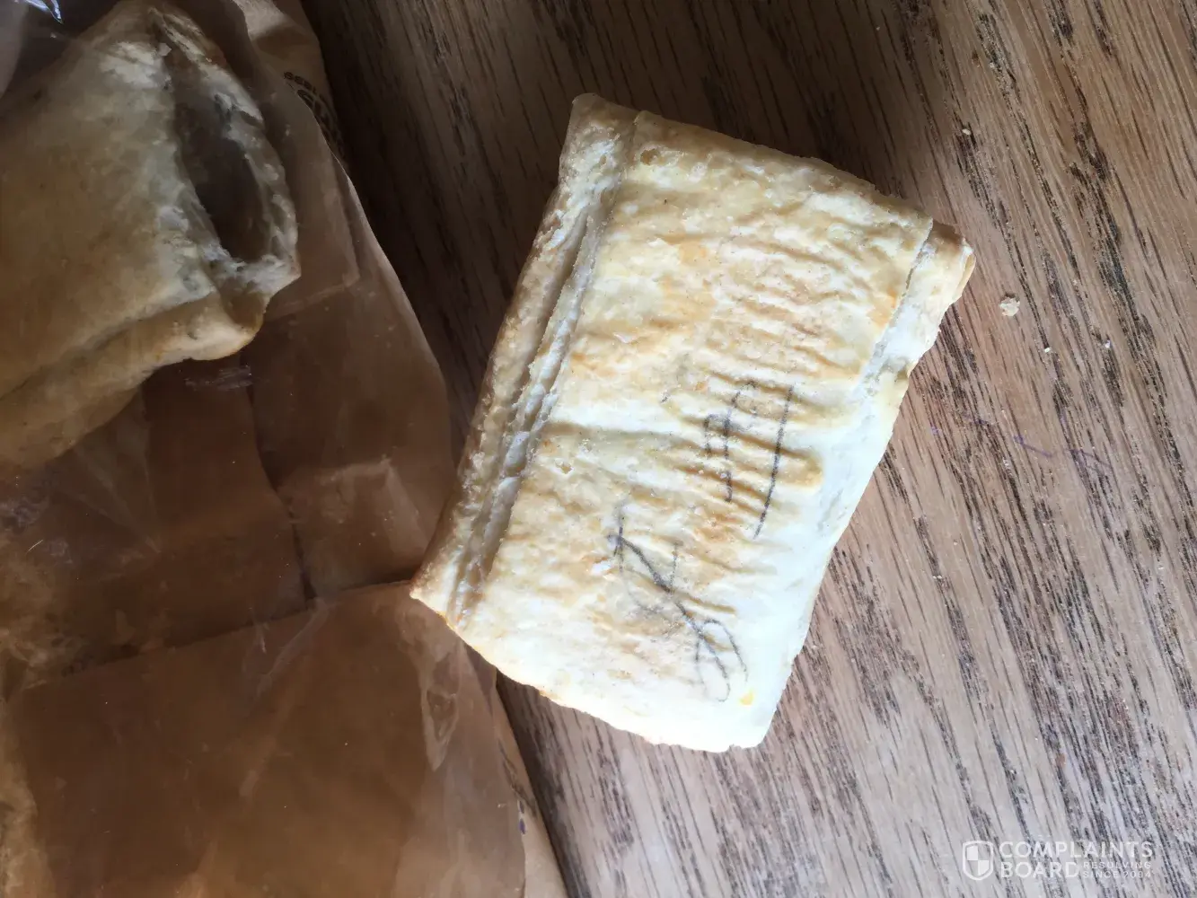 After purchasing 8 pack of pork sausage rolls from the in store bakery yesterday 17/03/2019, on returning home to have a snack, after eating x6 I was to find on one at the bottom either pen or pencil writing not knowing if others had this too I am sending pics for you to view, and hoping you can explain how this has happened, thank you Mrs Julie hall.
