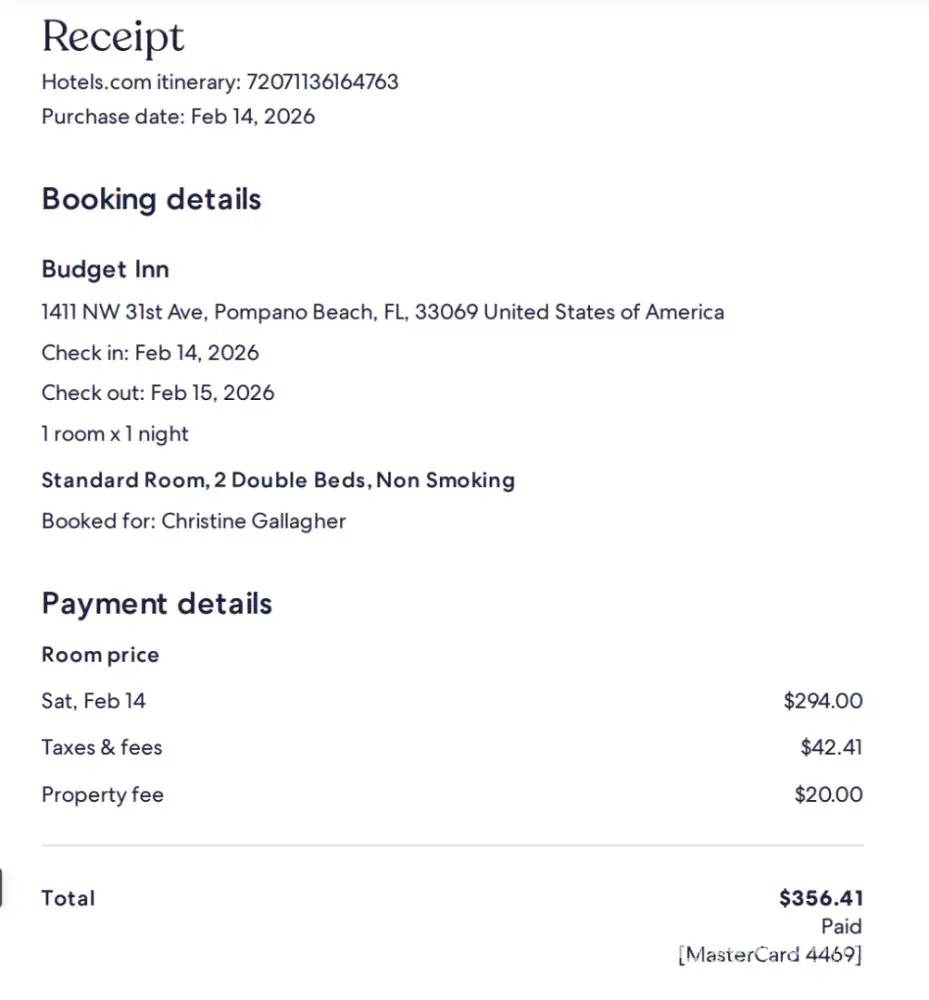 We booked our room at Motel 6 in Ft. Lauderdale through Expedia MONTHS in advance for a decent price. We arrived on the day of our reservation (Feb. 14, 2026) at 3:00 pm. I overheard the clerk say to another gues that they had overbooked. When it was my turn to check in, I was told by the clerk that he couldn't find our reservation. I gave him the printout...