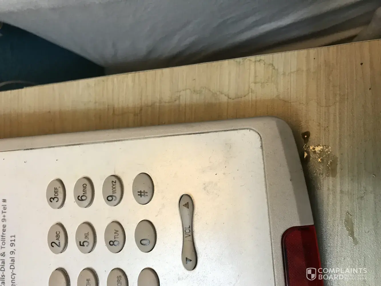 Very dirty bathroom coverd in black fingerprints and black hair. Toilet covered in black stains and urin. Sink coverd in hair and black stains. Floor covered with black sticky substance. Walls and doors are covered with black stains. Garbage cans are full off garbage. Desk draws are filld with empty pop bottles and potato chip bags. Remote control for TV was under the bed. Night stand covered in sticky substance. Phone coverd with black stains.