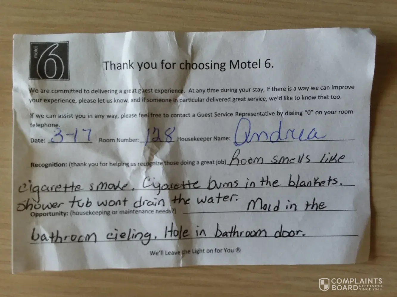 Motel 6 earns a 1.1-star rating from 3 reviews and 1037 complaints, showing that the majority of guests are dissatisfied with their stays.
