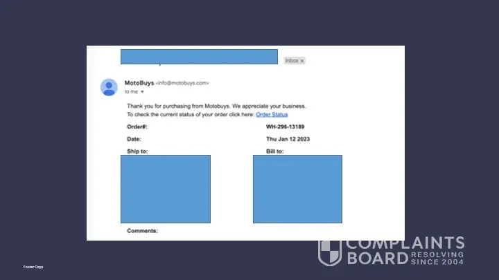 Motobuys is confident that our longstanding commitment to satisfy our customers will stand on it's own merits despite the filing of a false complaint like this one.