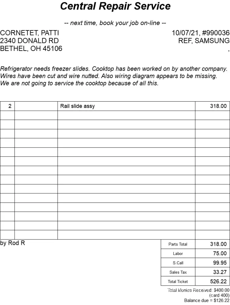 Service tech’s words: “… he wanted a breakdown on parts and labor, I explained to him that I cannot do it…customer declinedâ€