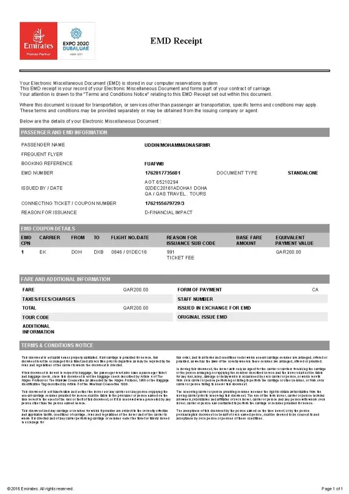 last 01/12/2016 i have travel from Dubai To Doha by emirates airlines, ticket number :[protected] . Doha emigration Department not issued the Qatar visa for me, so, i back to Dubai by next flight of emirates airline. Emirates Air stuff taken QAR 250 by cash and given hand writing board pass no. 176-[protected] they told me, payment receipt it will send by mail but not yet send me. last 06/12/2016 i have contact with emirates Airline contact center than they send me a payment receipt with QR 200. but i have paid QAR250.