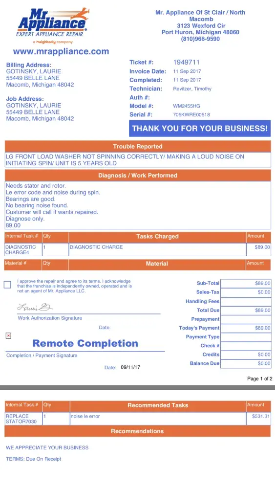 Mr Appliance showed up on time and wore their shoe covers. They did remove a piece of metal from my machine. I did not recognize the metal piece. They charged me $177. My washer ran a cleaning cycle and then I tried to do a load of clothes. It got stuck at the same place in the cycle. I called them back. They said it needed a drain motor and that would be $175 for the part and no labor charge. I looked up the part myself on appliancepartspro.com and it only cost $109.I have been able to wash clothes using the less used cycles on my machine. I think it's the mother board and not the drain cycle.