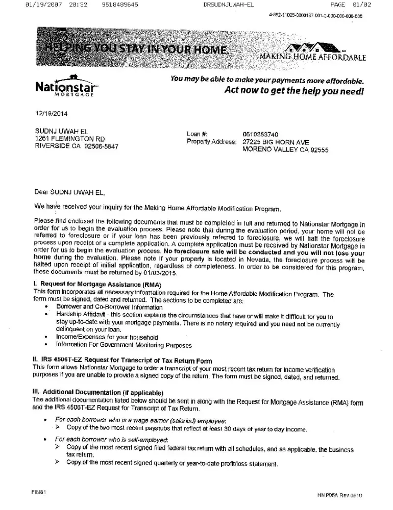 I applied for a Loan Modification with Nationstar Mortgage. Each time that Nationstar sent me a "Helping You Stay In Your Home" packet with the "Making Home Affordable" documents I would fill them out and sent them back to Nationstar Mtg. 12/19/2014 I received another packet, I returned the completed Loan Modification Documents. 2/15/2015 I was assigned a...