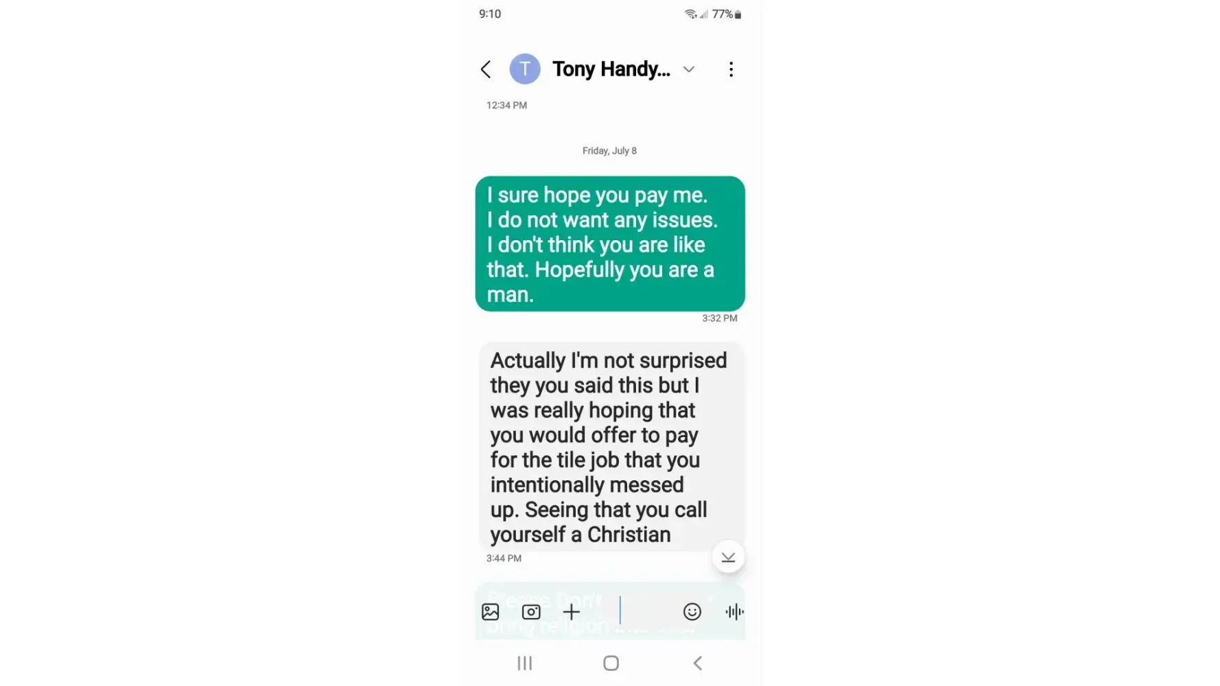 Customer complained and Tony jumped all over me for the work that Joe one of his employees did.
