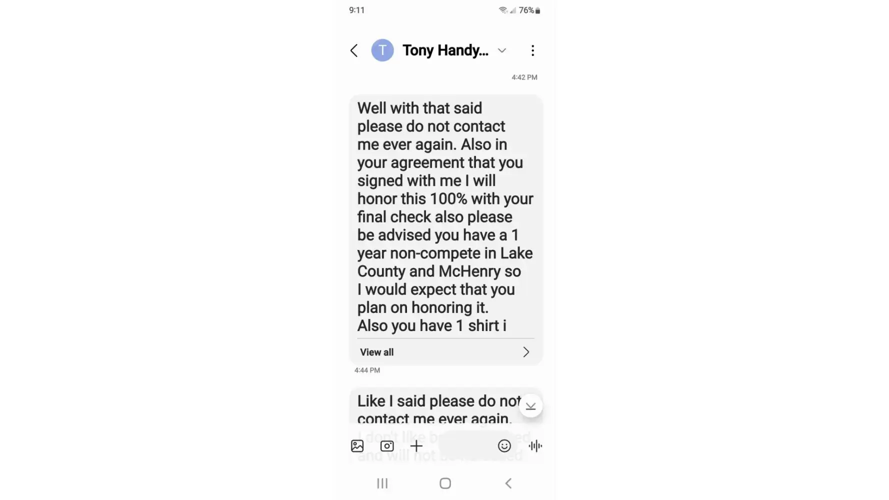 The day I quit I was going to work for Mr Handyman of Glenview and not only has he threatened me through a text not to see him or employees face to face if I know what's good for me.