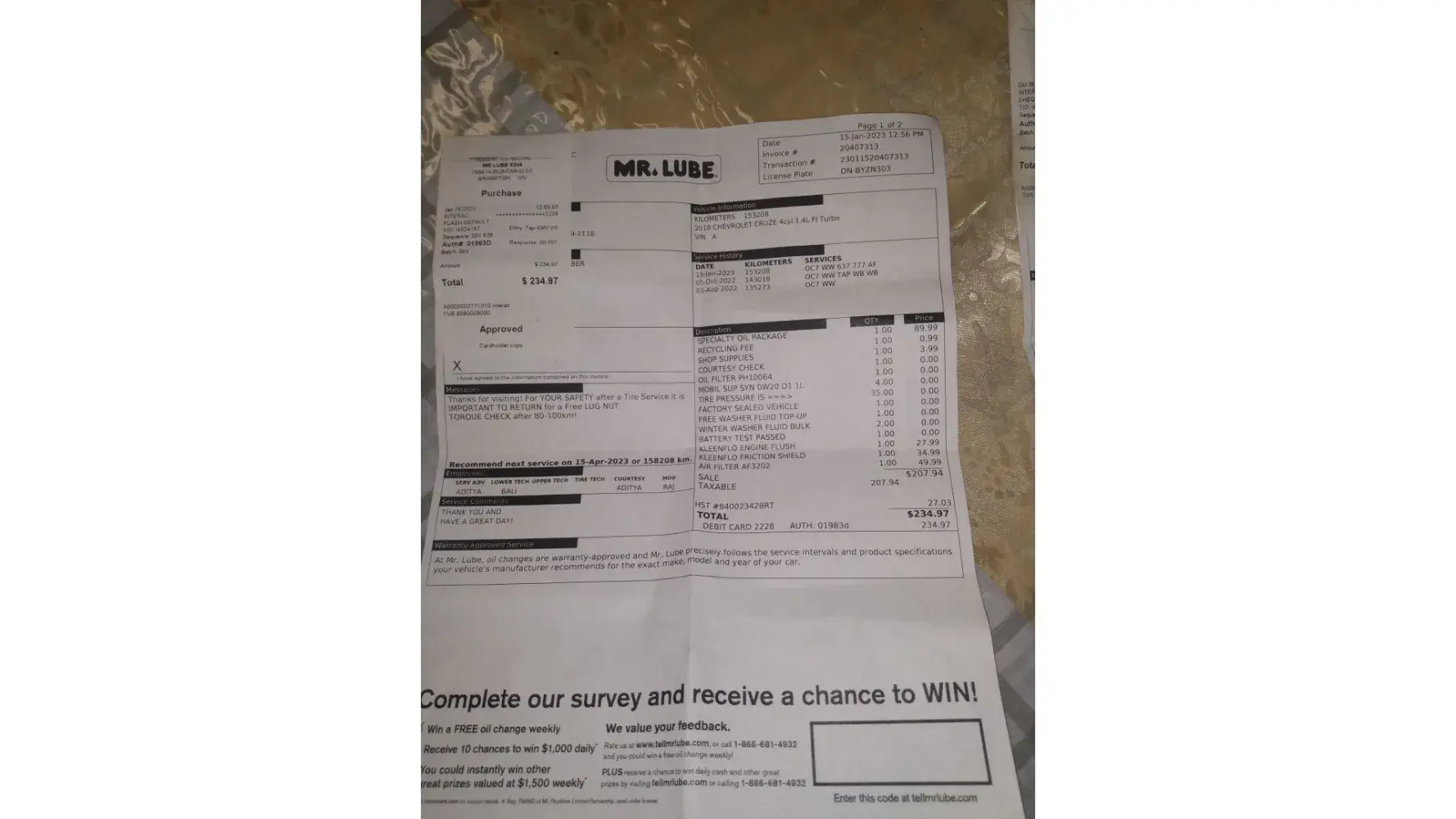 Hello. I recently visited the location at 328 University Drive, West, Lethbridge AB for an oil change on June 14th, 2023 @ 8:39 am after purchasing a new vehicle (used 2010 GMC Terrain SLE) for my Wife, and thought the experience was very positive. During the visit the staff was extremely attentive and seemed knowledgeable. Again, I went into this location specifically for an oil change, and did not intend on getting anything else done on this vehicle.