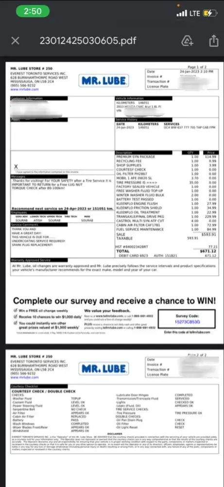 My name is Jawad Hamidi and I am a Mr. Lube Club Member. I recently sent my wife to store #130 in Richmond Hill for a simple tire rotation for her vehicle, with plate number CKJE824. The service was performed on 31-Mar-23 and the invoice number is [protected].