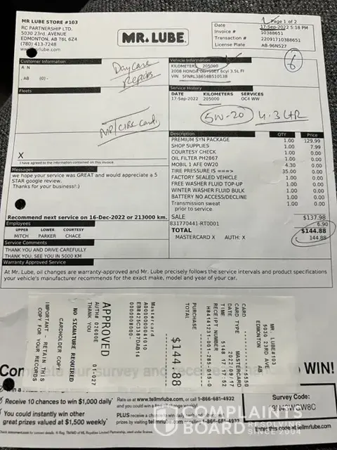 I was having battery issue while starting my car few days, so I went to same Mr lube in Walmart Edmonton south. I was charged $125 just to see my battery and $187.50 for labor charge, I asked why $125+$187.50 just to change alternator, manager got really upset and didn't give any explanation and really rude. I hope I can get any help for this overcharging scam