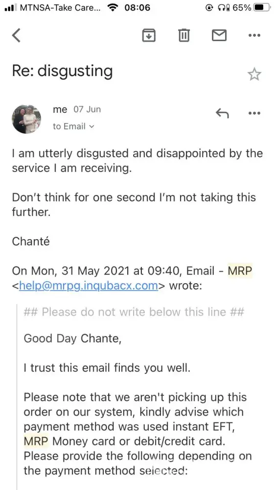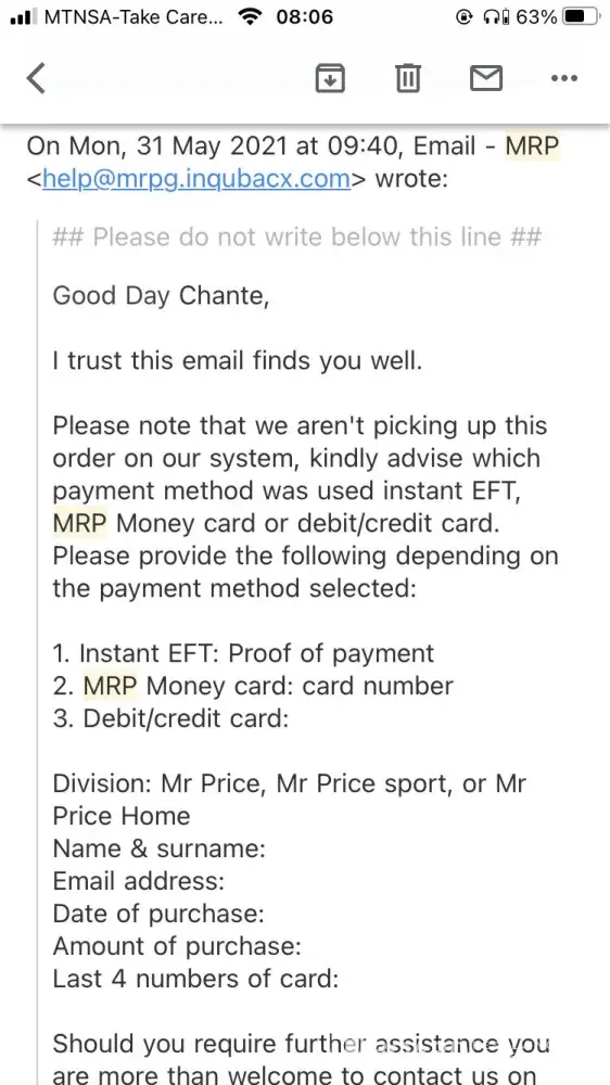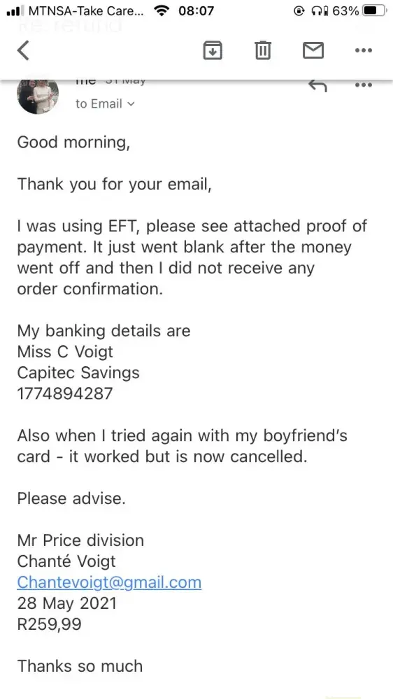 I bought online on 21 May 2021 ( R649.98) and still haven’t received my order nor does it reflect on my order history. I called later that week and was told to send proof of payment. I sent my bank statement which should also serve as proof of payment because it clearly shows there that the money was taken. A few days ago I received an email saying that I need to send proof of payment from my bank because your finance team wants proof of payment and not a bank statement. This is truly disturbing because when I purchased everything was smooth but now that the money is gone I need to hustle for my goods to be delivered. Your books should show you where the money is, especially because I sent my bank statement. Now I need to go to the bank to get the proof of payment since I didn’t request for it when I paid (which is exactly why I bought online, to avoid driving out and standing in cues - it should be convenient for me).