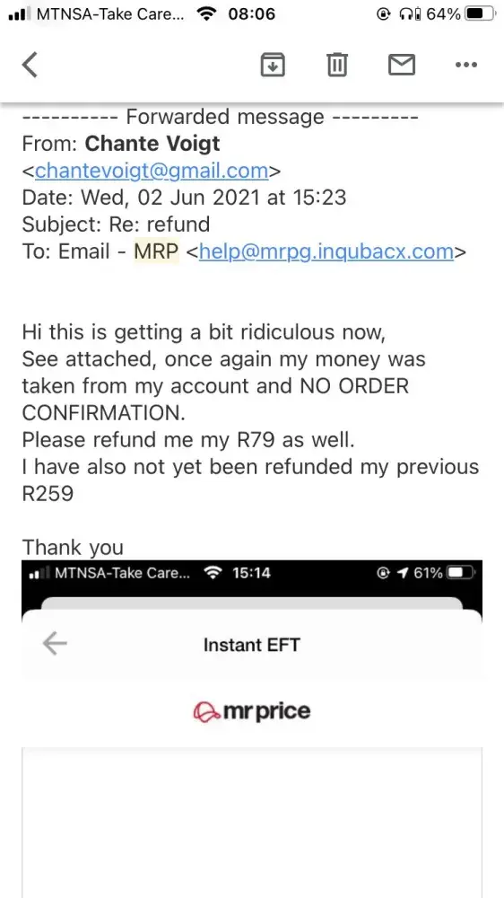 She have sent a few enquiries about her order since the 28th of May 2021 and have communicated with more than one consultant. None of them really assisted her or gave feedback, but send her messages saying they will provide feedback in either 24 or 48 hours. She have sent her proof of payment to each of the consultants. She was told they can't trace her payment, which is weird cos she have a prove of payment with MrPrice's account details and the date and time of payment. Now she has to spend money on data and airtime to contact them and send them documents she has already sent a few times. she just want her money back please.