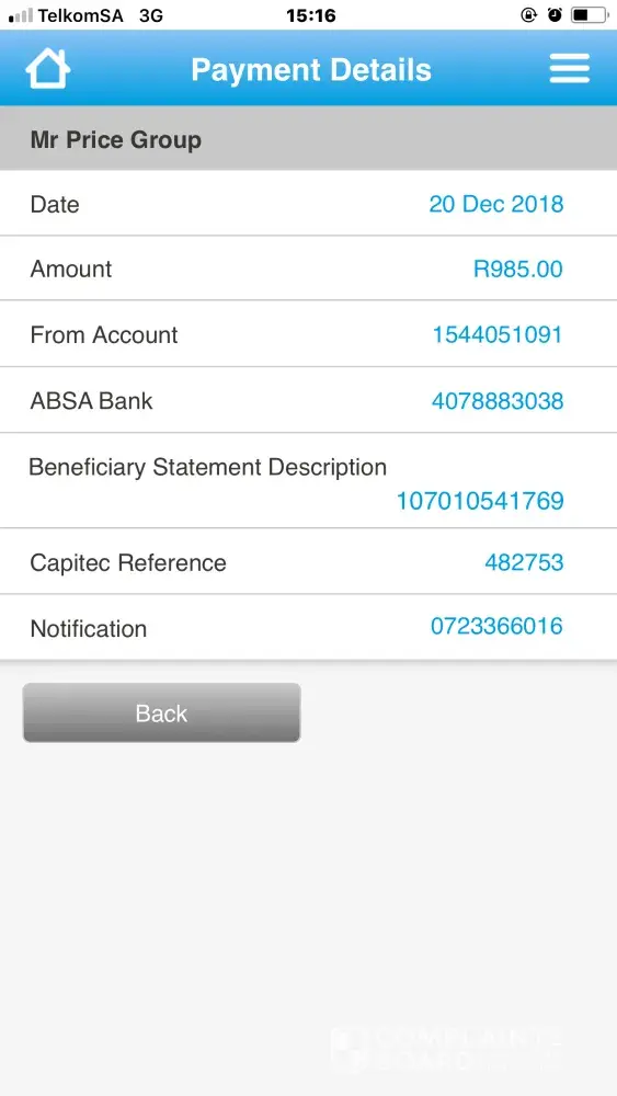 Am cynthia manogo and I have a problem that I faced when I was trying to buy clothes from mrp online shop. I purchased clothes on the 20 dec 2018 at 13:01 it's when I finished processing the payment but I didn't get any order number and on the app it showed order numbers and the status was canceled so the following day I called the call centre to ask if why didn't I get the order cause I have paid I only received a notification from my bank that I have paid mrp group r985, 00 the consultant said maybe the payment will reflect after 48hrs cause they're using absa bank. After 48 hours I called on saturday explain my problem and the consultant said I should call on sunday only to find out that the call center was closed on sunday then on monday I called and they said I should email my proof of payment and I did and called back they said I should send the proof of payment again cause they didn't receive it I send it but still no response again or any progress then yesterday which was the 27 dec 18 I called to ask if when can I receive the order cause I need it before the 29th and if it's possible can I change the store as am relocating and they said is not possible so I said can I then get the voucher even though I didn't want it but because it's late i'll take it they said I should wait for 48 to 72 hours again so the financial department can process the voucher. Now am so angry and disappointed because I brought online hoping the service is better than instore and the reason I brought online is because there were no sizes in store so now what I need is either I get the voucher before the end of today or just send me back my money cause it's been 7 days now calling the call center but not getting any where so am just tired of it. And that's my email [protected]@gmail.com