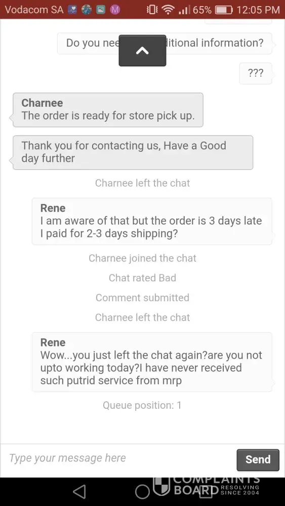 I placed an online order on the 30th of Jan, paid for shipping 2-3 days, order arrives on the 5th pf Feb (I np longer need the items now) when asking the agent Charnee what will happen to my shipping fees as its 3 days late c says its ready for store collection and leaves the chat...you did not even solve my query but you left the chat, then another agent takes over Maria and assist nicely advising I can return it in store, credit my account and send an email to get a gift voucher for the shipping fee, Charnee on the other hand no apaplogy for the late order or the putrid customer service from you..if you dont want the job please leave it, so many people out there wants to work with a passion for customer service...I have never in my 10 years of having a mrp account had such service...