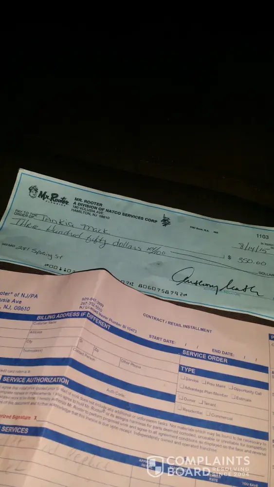 Mr Rooter from Hamilton, 180 Volusia avenue, NJ was called on late July to fix my renter 281 Sprint St, Trenton, toilet which was draining water on the floor. I had asked her to call Roto Rooters, but she ended calling Mr. Rooter. Some one came and plunger her toiled for 10 minutes and took $350 cash. She called me an hour later and complained of persistent...