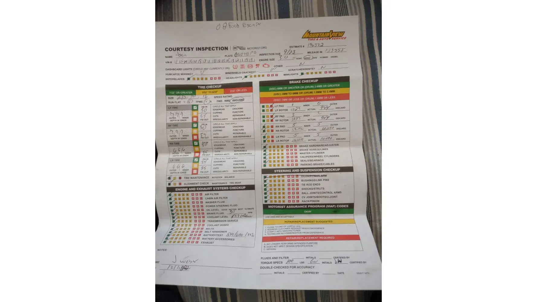 I explained I was sure it needed front pads and possibly rear. I asked that he examine the rotors for turning purposes ( told him no catching or grinding). I also told him that both front sides made loud clicking noise in deep turning. Having owned a used car lot for many years I said, “ I don’t know if it’s the cv boots, the bearings, tie rods or struts. Either way, both sides have issues.” I asked for a tune-up, oil change, a/c charge, free diagnostic’s and inspection for damages, and the $89 alignment.