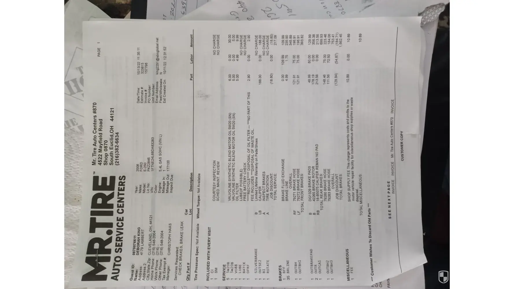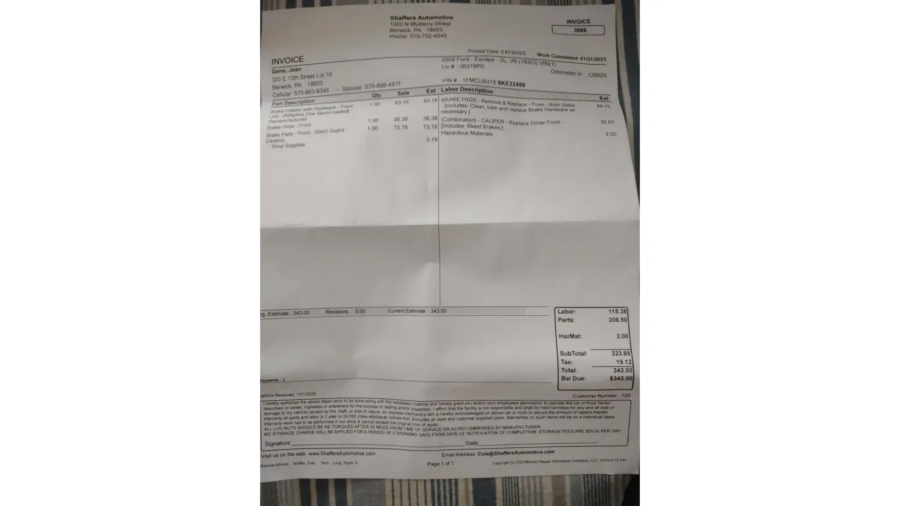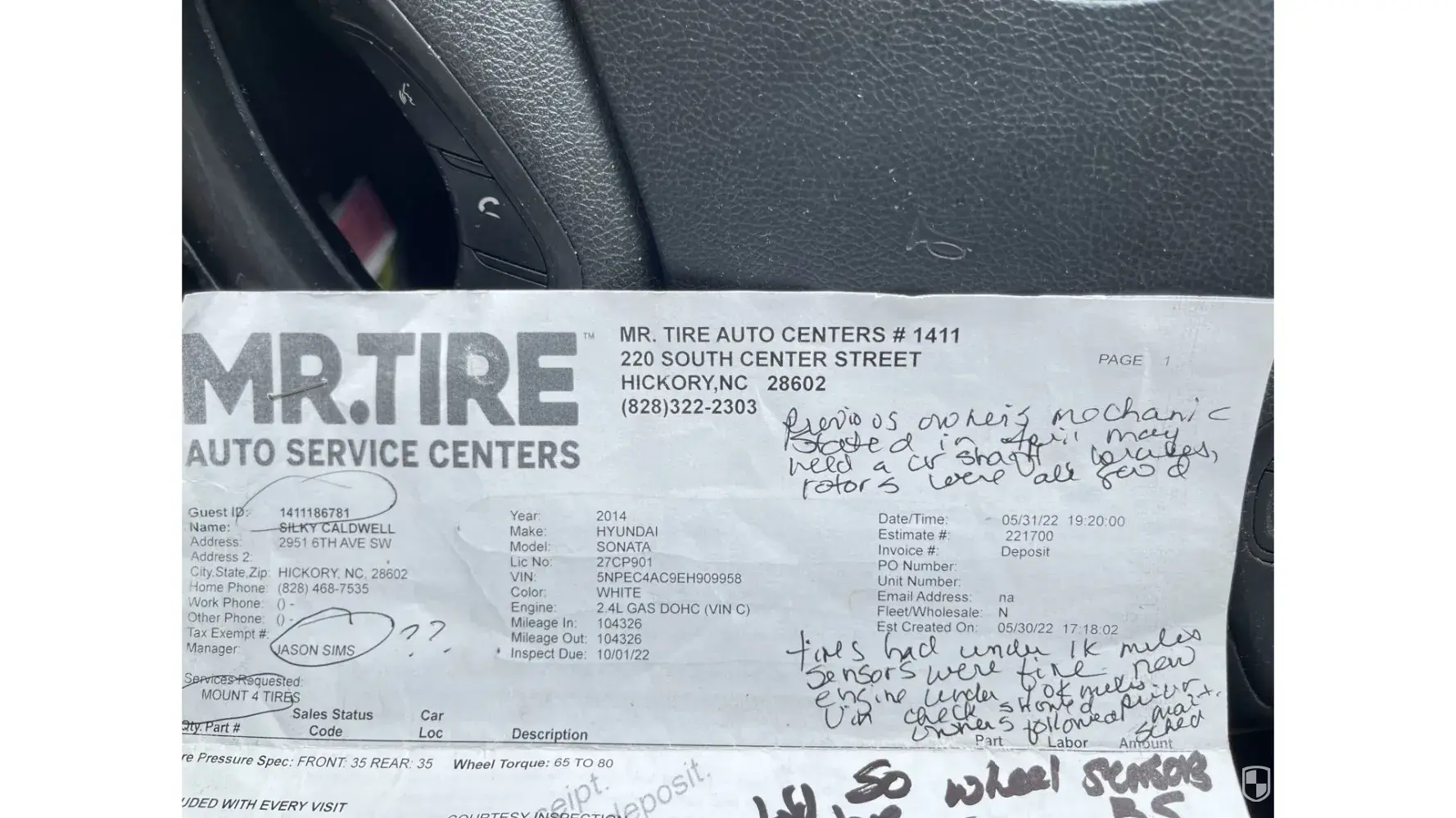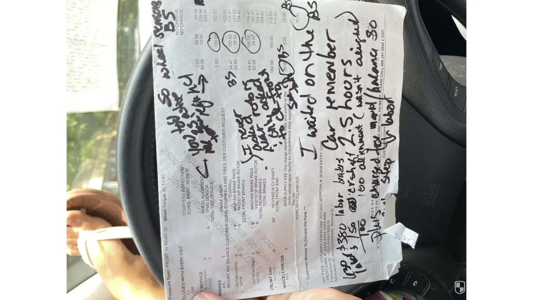 Here’s what was done supposedly: wheel alignment 89.99, sensors $239.96 ( tires had 800 miles on them, Tires mounted $100, 1 Outer Brk pad, 1 outer back brake pad, 2 outer F & 2 outer B rotors? What? $768.82, 1 RF VB shaft $319.99 and $39.99 misc shop fees.