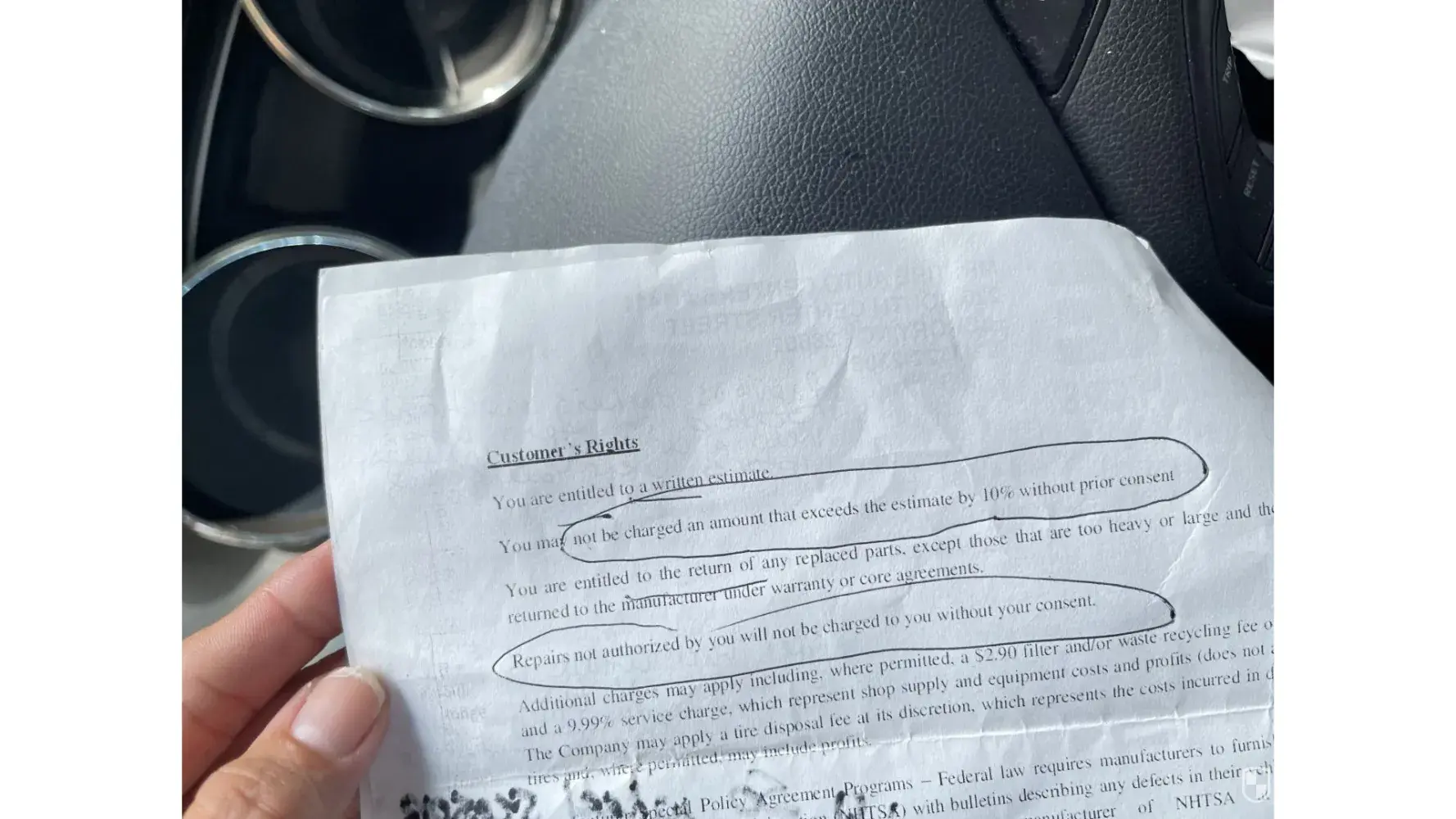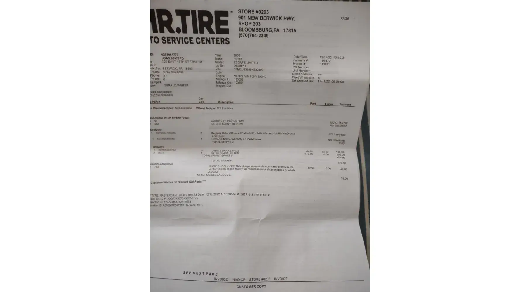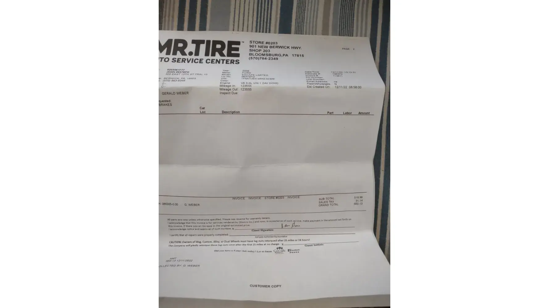 i took my 2021 ford escape to mr tire on rodi road penn hills november 9 for state inspection. i informed the person on the desk my car was driven a little over 2000 miles the previous year. he printed up a work order for me to sign with an estimate with conventional oil change of $115.00 when my car was finished. the charge was $148.00 he charged me for emissions testing instead of giving me a waiver. i have had my car since october 2021. when i objected, the man kept pointing at my signature on the receipt saying"you signed it". i signed a work order permission not a receipt. instead of listening to me this man deliberately ignored me and refused to give me my receipt and paper work. instead he deliberately began doing paperwork for a car parts delivery person he tried to tell me "pass or fail" i get charged." i stated i get a waiver not charged.