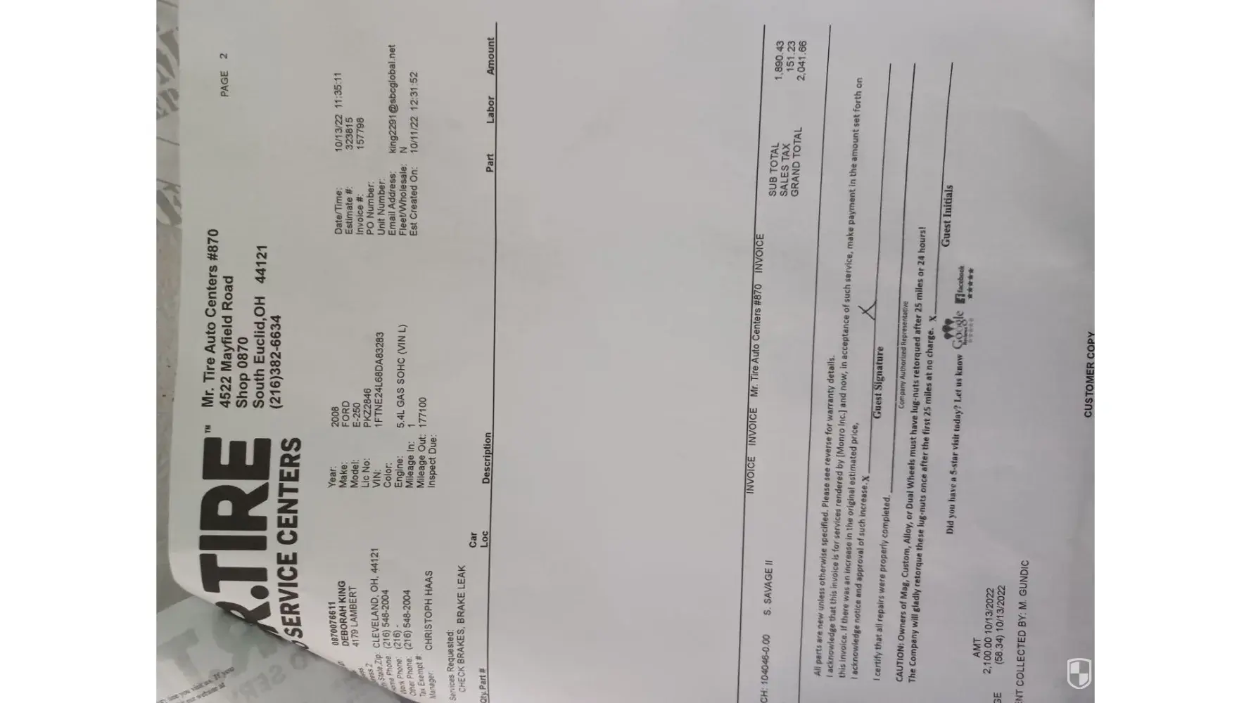 Other than the $100 for mount and balance and $89 alignment I was NEVER given a price either verbal or written. Bill popped head in from garage 2x. Once, saying I’m assuming you want me to replace wheel sensors. I assumed we were talking about weights…I’ve never had anyone ask about anything else in likely 100’s of sets of tires in my life. The other time was to tell me, sadly, I needed a new axle. Ok what? I said you mean boots? No, those were shredded and gone. I hadn’t been in the business for years, was under great duress and assumed I was not understanding him. If my axle shaft was gone I highly doubt I could have driven car in. So, I said ok.