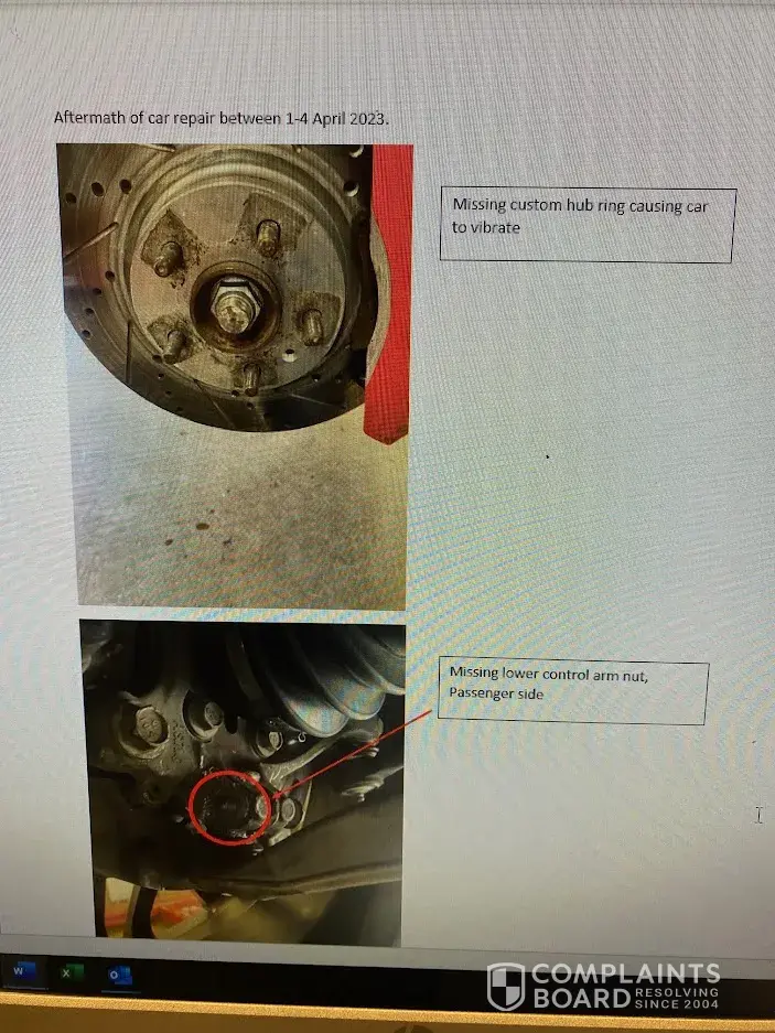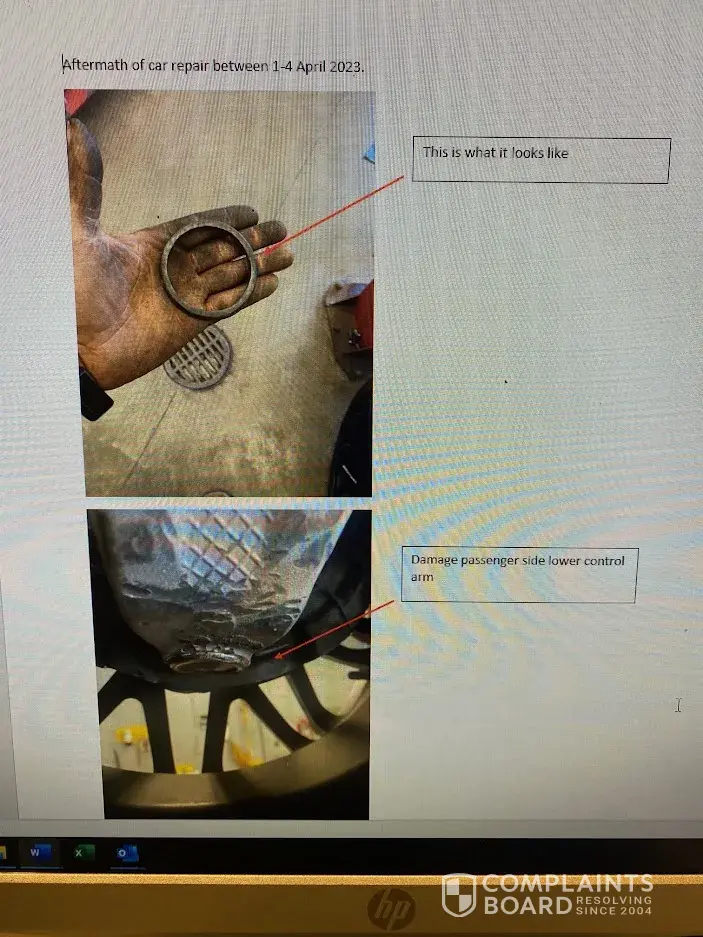 2) April 1, 2023 I brought the Fusion in about 0900 am for repair because that’s when they said the tech expert would be there. They did not have it fixed that day. They said the mechanic would be there Sunday April 2, 2023 to finish the job. I came back towards the end of the day and the car was not finished. Monday April 3, 2023 my car was not finished claiming they had to order new tie-rods and lower control arms. Which I had brand new ones installed before I came there.