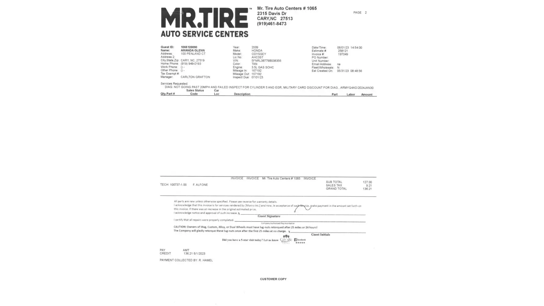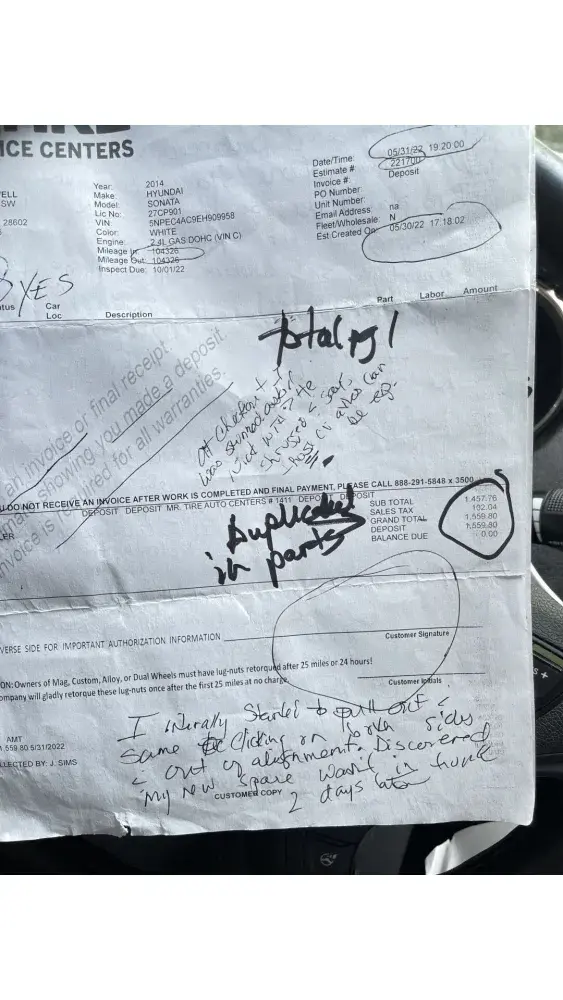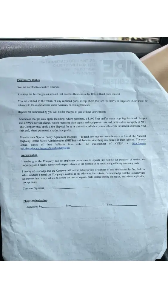 It’s worth noting that my copy of the bill states estimate created on 5/30 and the bill printed on 5/31 states not an invoice an estimate. Invoice # deposit. No signatures. No initials. I’m exhausted already and I have vehicle 2 to go. Vehicle 2 was taken in on July 29th for alignment and fuel diagnostics. I was told I should be able to pick it up the following business day and drop vehicle 1 back off to complete repairs. Vehicle 2 was still sitting while I stayed in a hotel waiting on it to tow camper to my pre-paid site 60 miles away almost 3 weeks later.