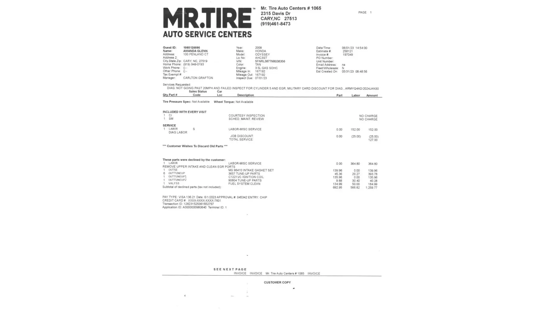 I made an appointment for my 2003 Mazda b2300 pickup at Mr. Tire store number 1554 6740 Frankford Ave Philadelphia Pennsylvania 19135. [protected] for check engine light code P0171 lean code and a coolant leak in the engine compartment left side heater hose. I was quoted a price of 2400 dollars to correct the issues by store manager Levi Perron. The appointment was set 9/7/2022. I received a called by Levi Perron the next day stating he could not fixed the coolant leak do to lack of tools needed to complete the job. At that point he stated the engine code P0171 was fixed. As I went to pick up my vehicle he did an engine tune up without notifying me and replacing vacuum hoses. Charging me 1,027.88 dollars. As I went to pick the vehicle up the check engine light was still on with a new code P2004 for the IMRC valve and the vehicle was running rough. Manager Levi Perron he could not fixed that part because it was factory ordered. My vehicle went into the shop with a total different code P0171 and running fine. He only changed two vacuum hoses. I believe I was sold a service not needed and after paying the bill my vehicle came out worse and rough ilding. And I still have to get the IMRC corrected. I used to go there for years but now the service is horrible and mechanics do not know what they are doing