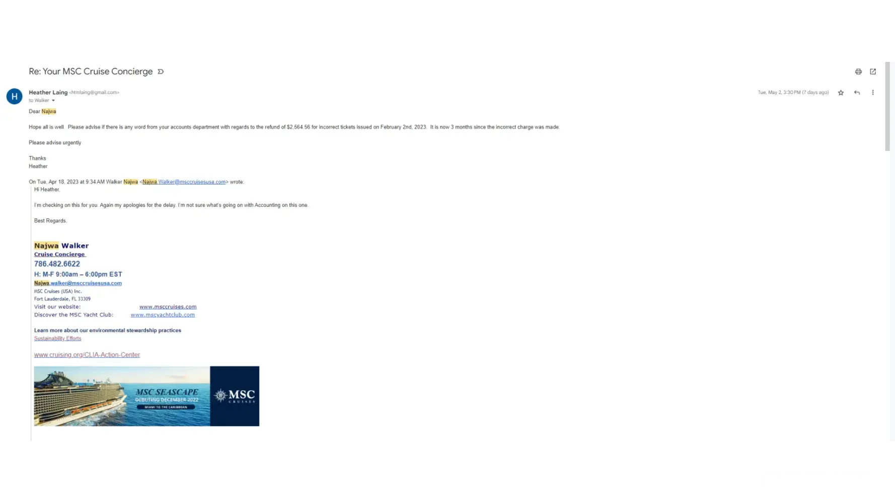 Please respond within five business days. I will be following up with MSC directors in the corporate offices until this matter in resolved appropriately.
