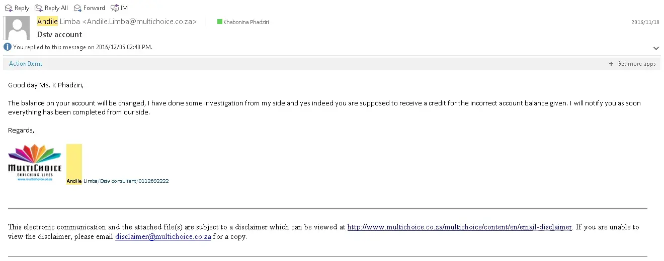 I am supposed to be credited for incorrect information given. i have spoken to numerous people. the last person being andile limba. See email below :