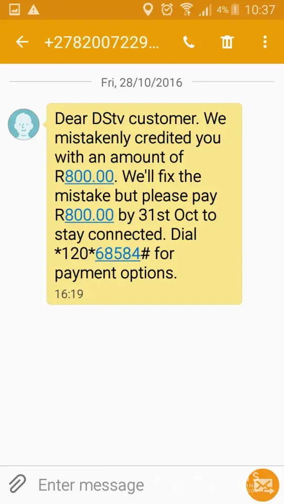 Dstv send me a sms to saying the following: "Dear DStv customer. We mistakenly credited you with an amount of R800.00. We'll fix the mistake but please pay R800.00 by 31st Oct to stay connected. Dial *120*68584# for payment options." Date: 21 October 2016.