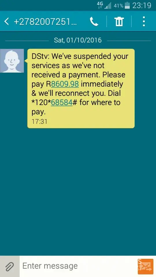 I paid my DSTV account on the 1 October 2016 which is the date you supposed to pay it by and this morning of 3 October 2016, I get a message on the TV to say my services have been suspended. When I phone the call centre, the consultant tells me that I have to now a reconnection fee of R50 for this month and also a reconnection fee for last month because my payment was done on 3 September.