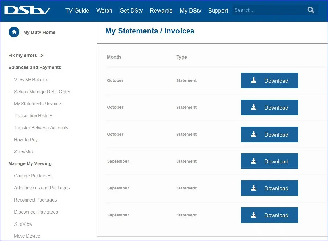 I have the DSTV Extra package. This cost R459.00 per month. End of July I requested a statement from January 2016 to July 2016, which I received and made a payment of R608.16 to bring my account up to date.