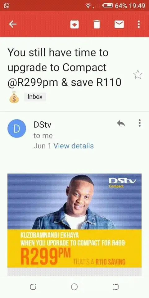 On the 7th of June I took a special offer from DStv to upgrade to compact at a monthly subscription of R299 for 3 months . At the same time I asked that my payment date be moved from the 2nd to the 7th of every month.My first month was in June, meaning that my 3rd and last month to enjoy this offer is August, but on the 3rd of July my services were disconnected for non- payment and I was required to pay R556.