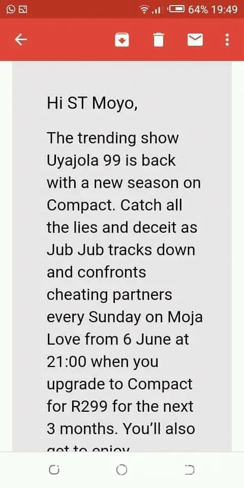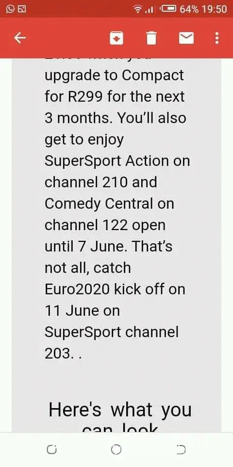 Desired outcome: 6 Months compensation of the premiums, free movies and a refund of the amount I paid of around R320 today.