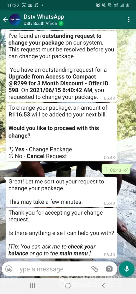 I have recently upgraded my package to DSTV compact on the 15th of June based on the communication received from you. I took the offer on the basis that I will be paying R299 for the next three months as stated. On the 28th I paid my account which requested R111.93, later on the 1st I received a communication that I have to pay R303.60 I then opted to pay via the app which then requested me to pay R119.60. Unfortunately this was not the case my services were disconnected today due to non payment, now requesting R326.26 to be paid. I then called multichoice customer care to query, I was assisted by Terissa Jordaan and I was told that they can't assist me as I no longer qualify for offer of R299 as I did not pay for the upgrade within 24 hours whereas the communication from the WhatsApp when I did the upgrade started that the outstanding balance will be added to my next bill. I then requested for team leader, they said they are all in the boardroom and I have to wait.