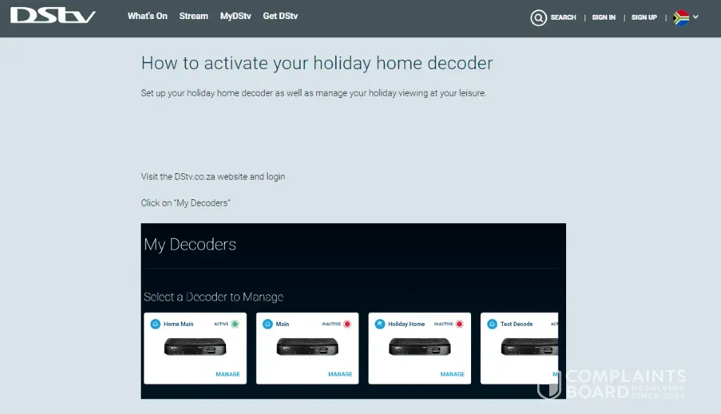 "please note that you cannot have your [dstv] residential and holiday home decoders both be active at the same time, it is either you activate the residential decoder or the holiday home~sk"