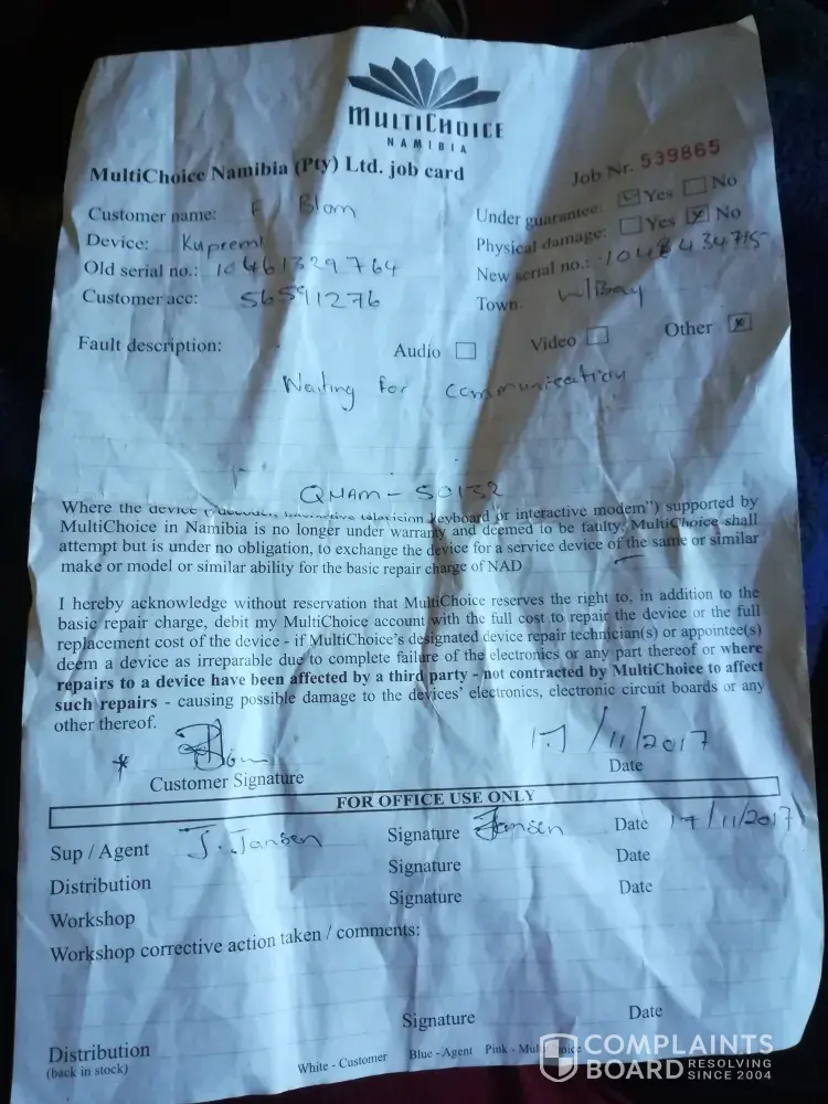 MultiChoice Africa / DSTV multichoice installer complaint