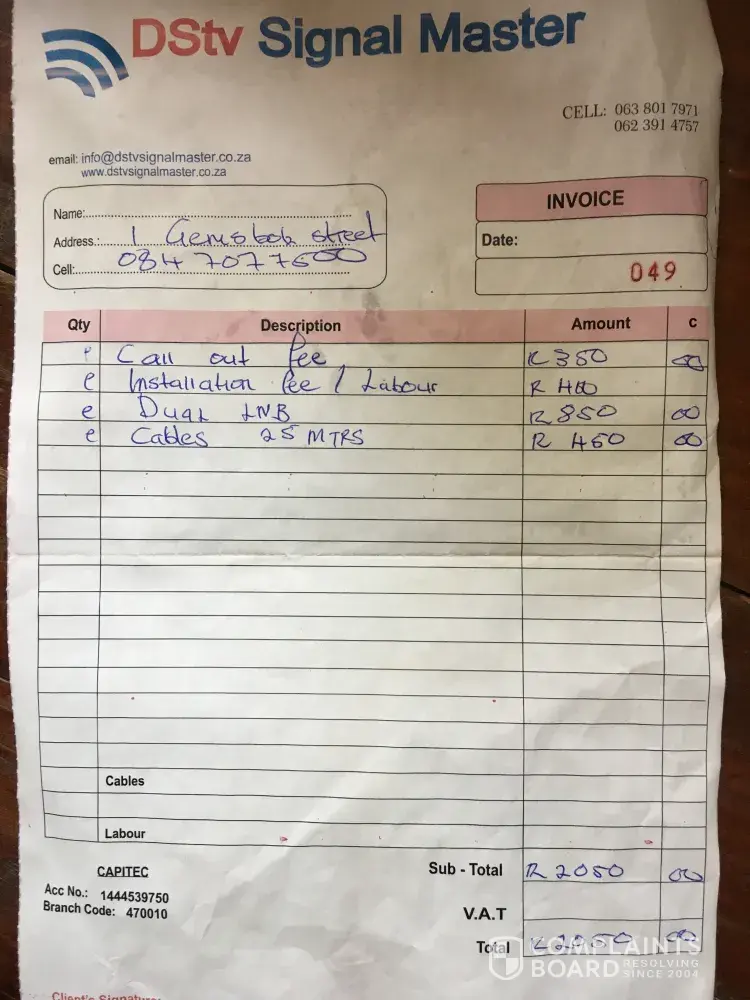 We are not happy with the amount being charged as we feel if this was the problem we could have installed a brand new dstv decoder and a full installation for R999.00 as advertised.