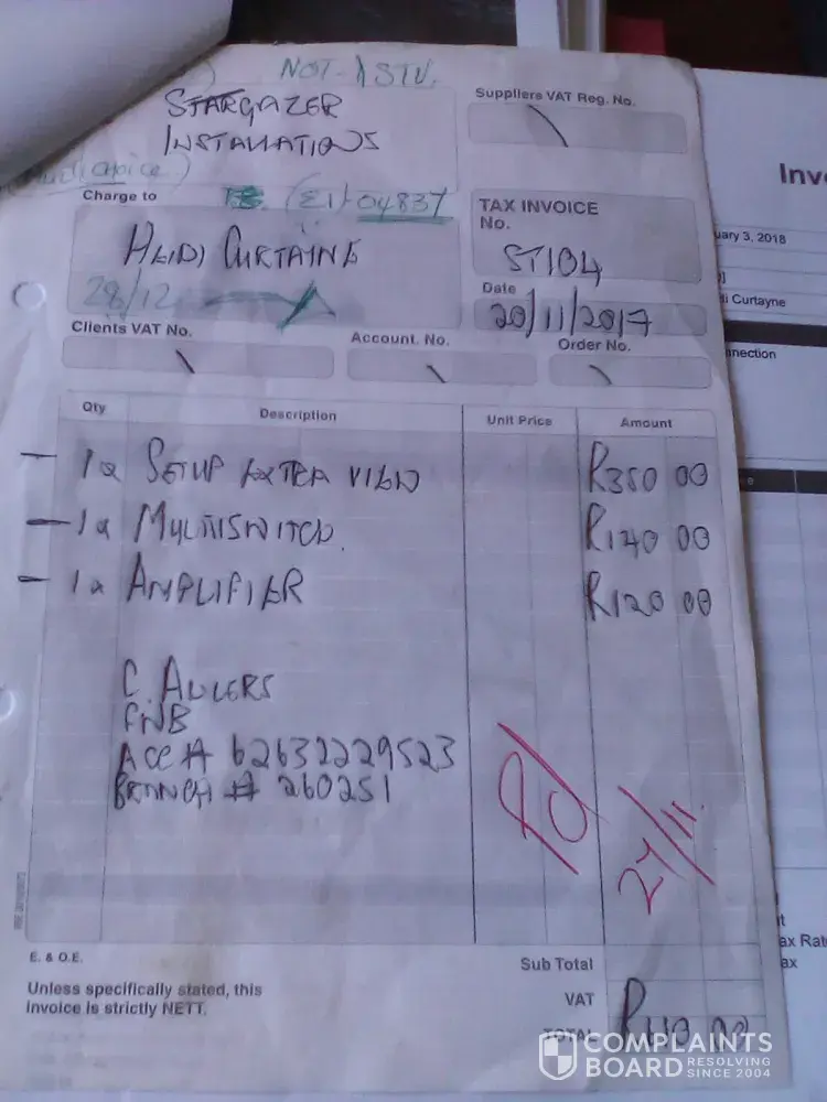 We applied for the DSTV pricelock option in October 2017. It then then took almost a month to conclude the application and for the items to be couriered to us. This was due to what they say is a backlog and the consultants taking down our address and telephone numbers incorrectly. Once we received the items we then got an accredited dstv installer to put up the dish and do the installation in the middle of november. Our DSTV has not worked since the installation. We have tried to get the installer, company name SETTRONICS, to come back and and fix the problem but he says he has to charge us now, which is absolutely absurd. We have complained to DSTV call centre and no action has been taken as yet... so in conclusion we are paying for a service for 3 months for nothing.