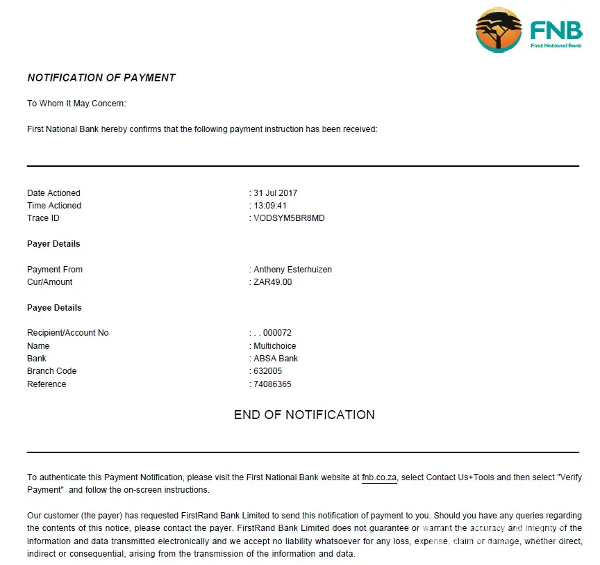 I have made a payment to multichoice on the 31 July for my Walker device subscription. Now my service is suspended & they first want proof of payment that it has been paid. I don't have facilities to send them the proof of payment at the moment. I have spoken to Sifiso at the Bloemfontein branch (manager), but he is of no help. See attached the proof of payment