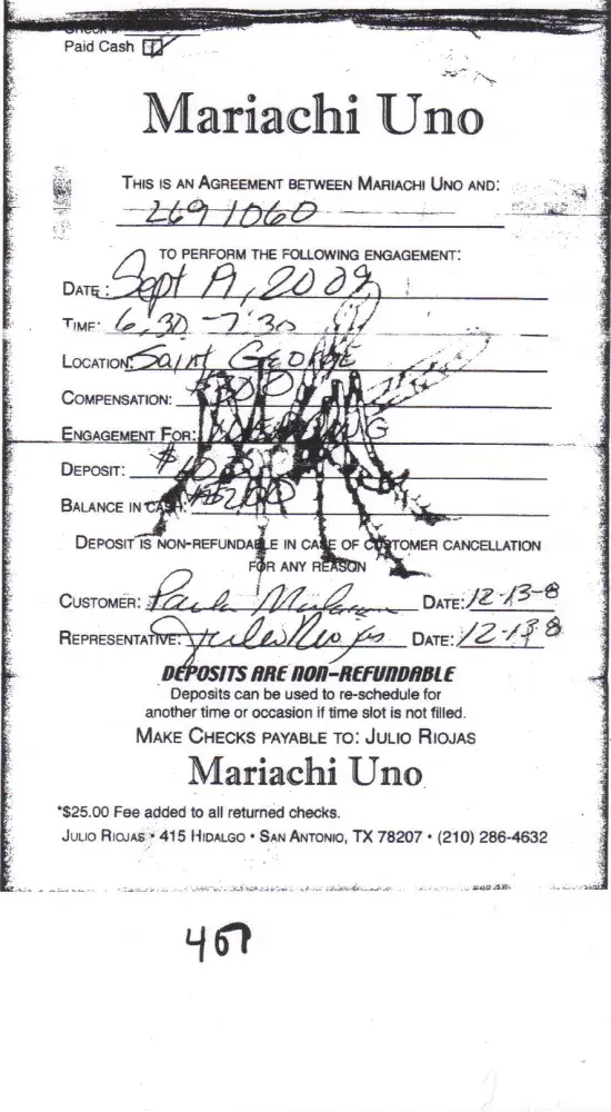 To Whom It May Concern: I have a complaint against Mariachi Uno c/o Julio Riojas who is the leader of the Mariachi group… on December 13, 2008… I signed an agreement with Julio Riojas for them to perform at my son wedding on September 19, 2009 and gave him a deposit for 100.00 dollars. He was suppose to perform between 6:30 p.m. and end his performance at...