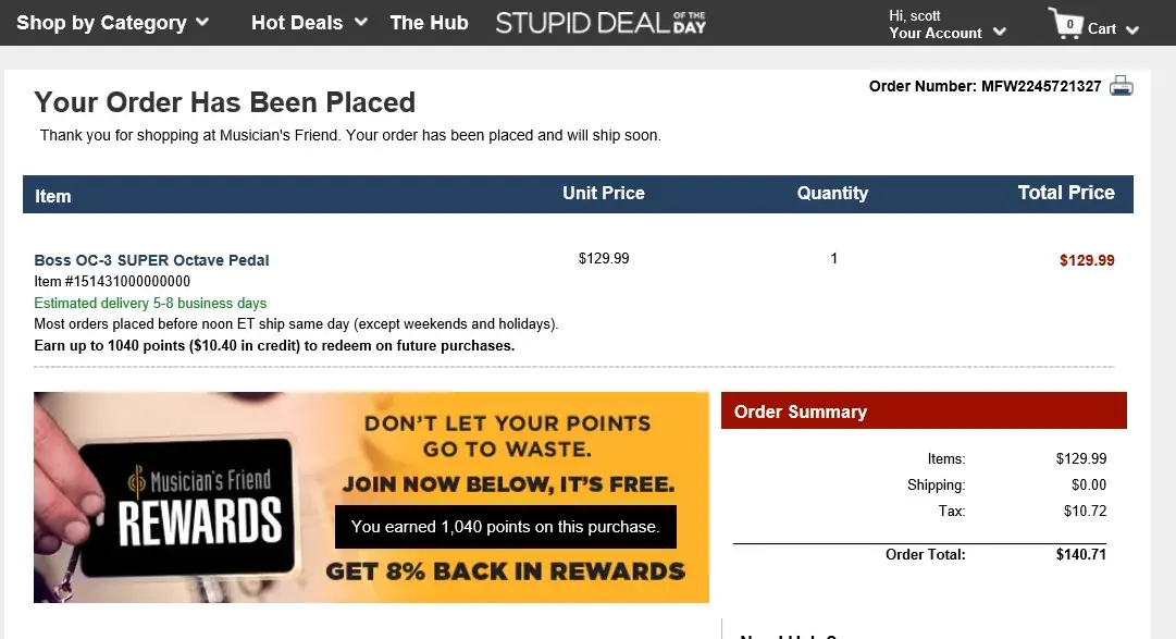 I placed an order #MFW1623287089 on 3/10/2019, which was cancelled by musiciansfriend on 3/15/2019.